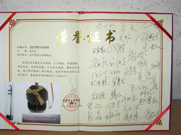 二胡制作大師丁家彭先生1949年出生樂(lè)器世家,17歲隨其祖父學(xué)琴藝,并深得精髓,其聰穎好學(xué),悉心鉆研與 探求二胡制作,博得同行的欽佩贊許,更得了許多知名演奏家的稱贊,充分認(rèn)識(shí)到二胡制作每個(gè)環(huán)節(jié),都對(duì)二胡制作都有影響力,因此對(duì)二胡的選材,選料,蟒皮都十分嚴(yán)格,二胡整體穩(wěn)定性良好,環(huán)境干擾影響極小。